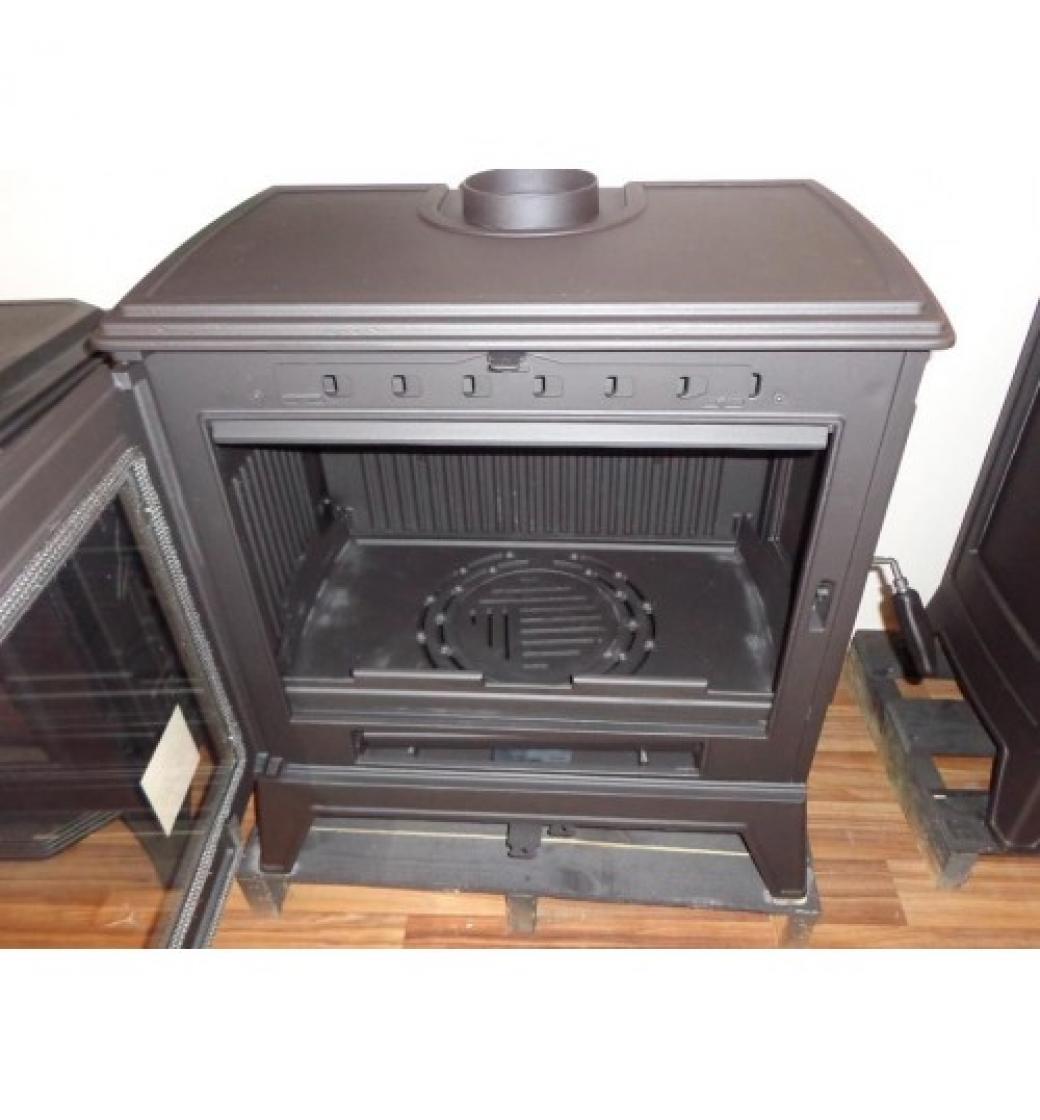 Litinová krbová kamna s bočním přikládáním o výkonu 14 kW, dvoustupňové spalování, celolitinové topeniště.