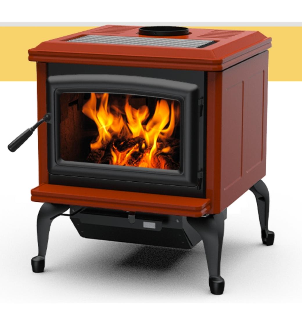 Kanadská kamna Pacific Energy SUPER CLASSIC cihlový smalt, černé dveře, černá mřížka, černé nožičky a popelníkový systém