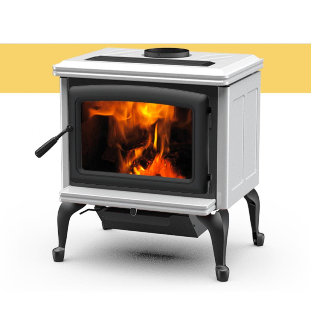 Kanadská kamna Pacific Energy VISTA CLASSIC bílý smalt, černé dveře, černá mřížka, černé nožičky a popelníkový systém