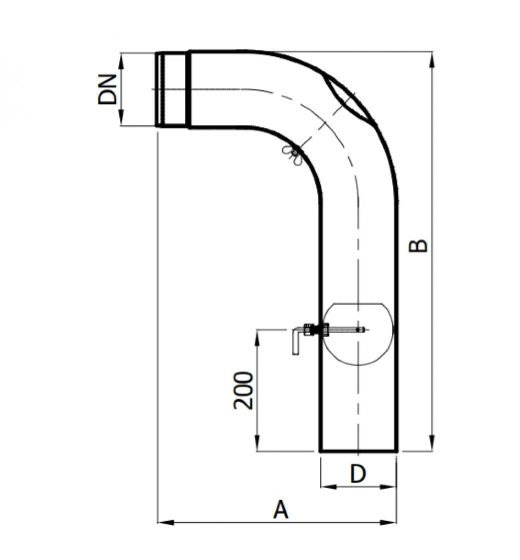 Koleno 90° tažené s prodloužením, klapkou a čisticím otvorem průměr 150 mm