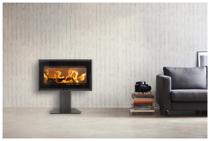 Kvádrovitá široká kamna, celoskleněná dvířka se samozavíracím mechanismem dvířek.