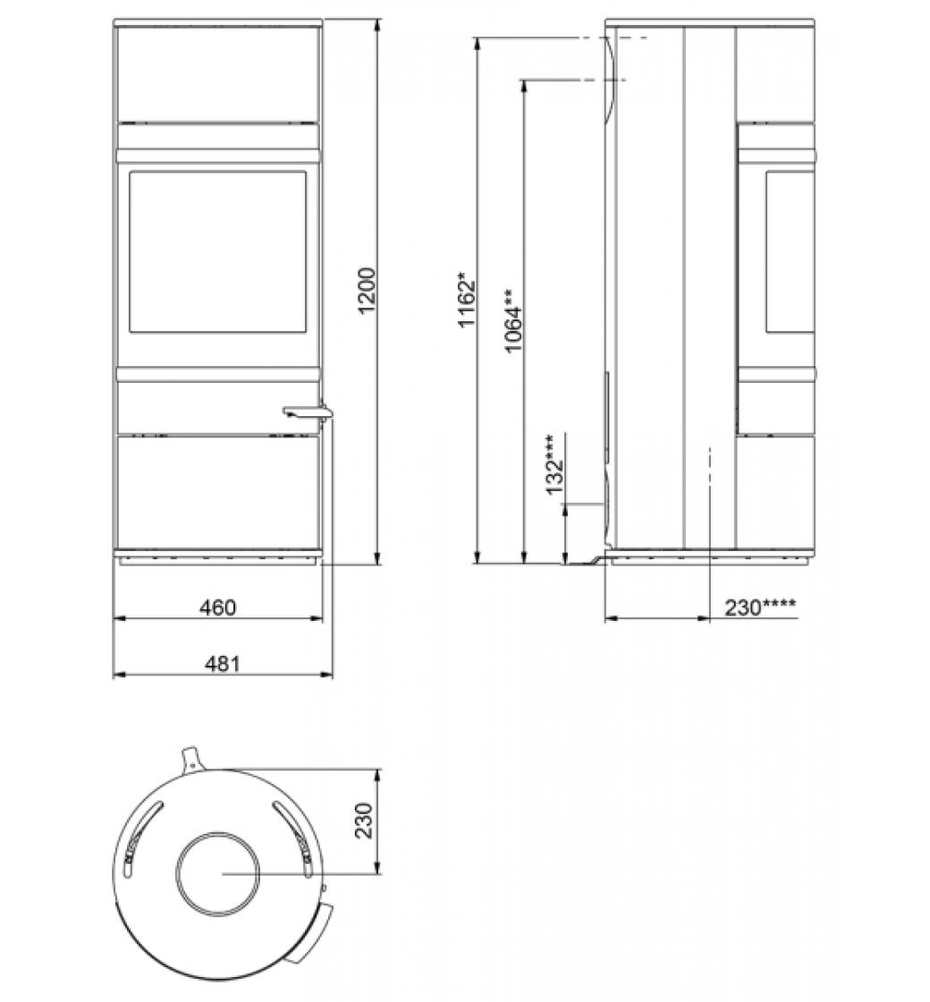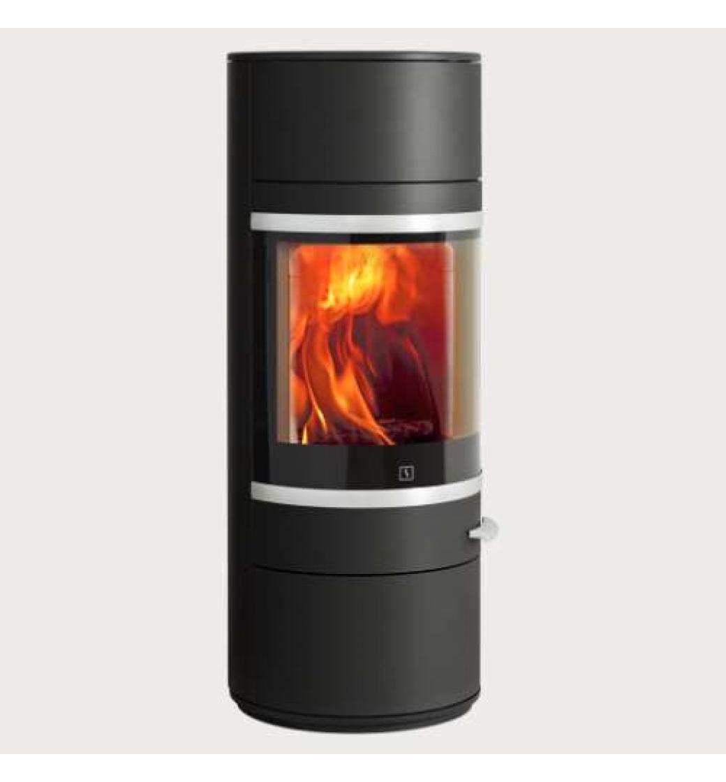 Velká panoramatická dvířka mají chladnou kličku. Opláštění je v několika barvách s černými lištami na dvířkách. Kamna lze vybavit otočným podstavcem a horní deskou z mastku.