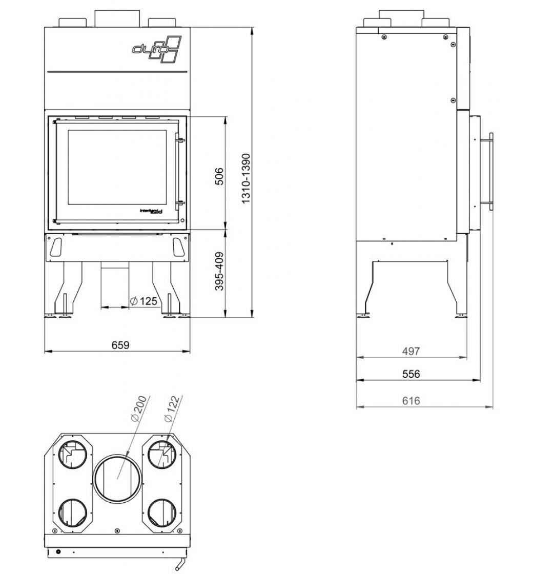 Pouzdro vložky funguje jako rozdělovač vzduchu. Ocelový horkovzdušný rozdělovač usnadňuje napojení vložky na systém potrubí rozvodu teplého vzduchu.