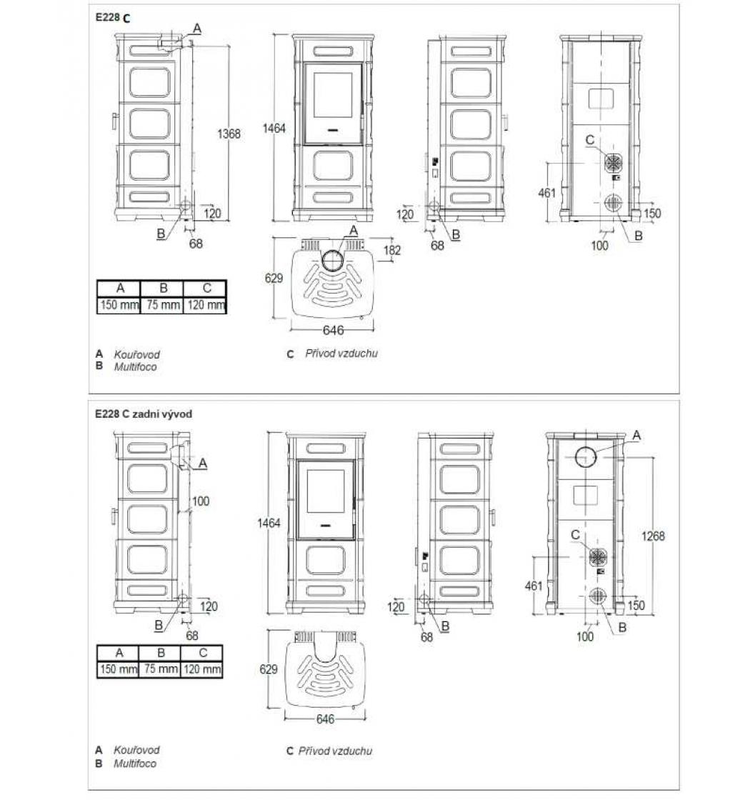 Keramický obklad, výkon - dřevo 4 – 12, pelety 3,9 – 8, průměr kouřovodu 150 mm.