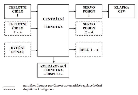 Regulace hoření spočívá v regulaci optimálního množství vzduchu do topeniště s cílem dosažení maximální účinnosti spalovacího procesu a nízkých emisních hodnot. Tato regulace probíhá ve 20 změnách pohybů klapky v celém průběhu hoření. Použití automatické regulace hoření uspoří cca 30% energie. Regulátor mj. obsahuje užitečnou funkci zvukové signalizace, která upozorňuje uživatele o vhodnosti přiložení paliva. Tato funkce je vypínatelná.