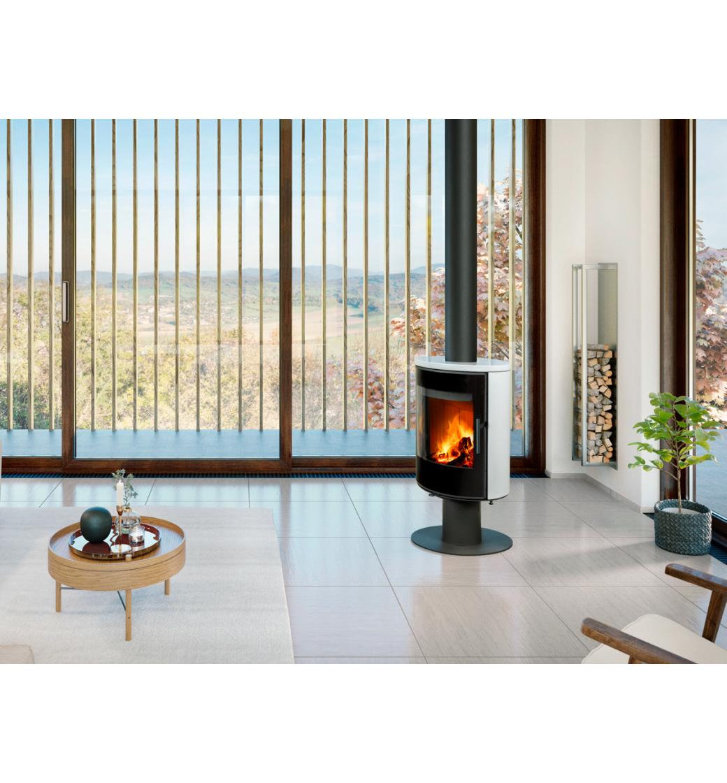Krbová kamna LAREDO T patří mezi moderní otočné modely na centrální noze, které umožňují sledovat plameny z různých částí interiéru. Keramické obložení kombinuje vysokou odolnost, stabilní akumulaci a esteticky čistý vzhled.