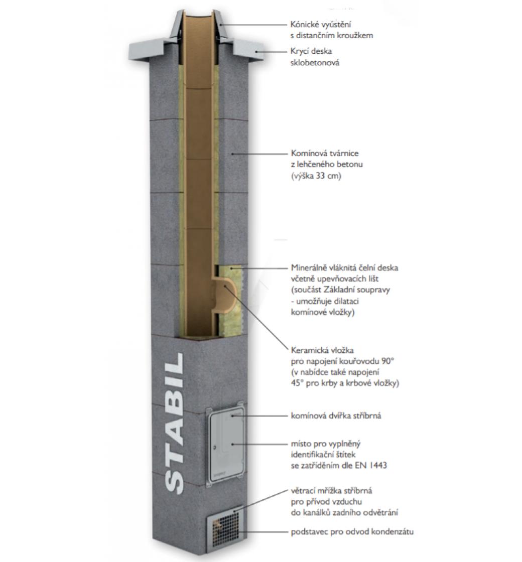 komínové tvárnice, komínové vložky, izolační rohože, komínová vložka pro kouřovod 90°, komínová vložka pro dvířka, základní souprava, krycí deska, sklobetonová pro zateplení (přesah 8 cm), kónické vyústění, maltová směs, maltovací šablona