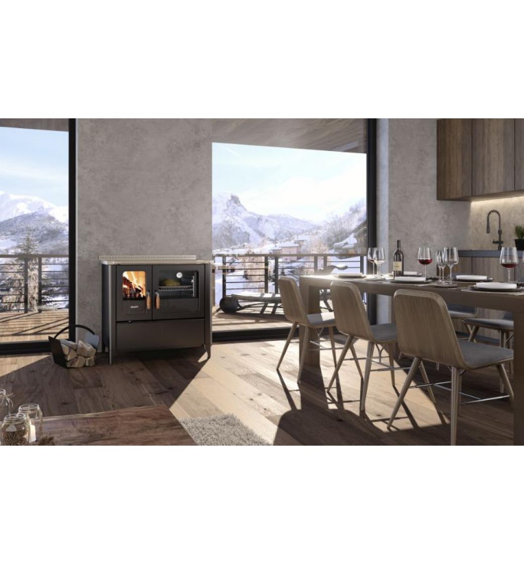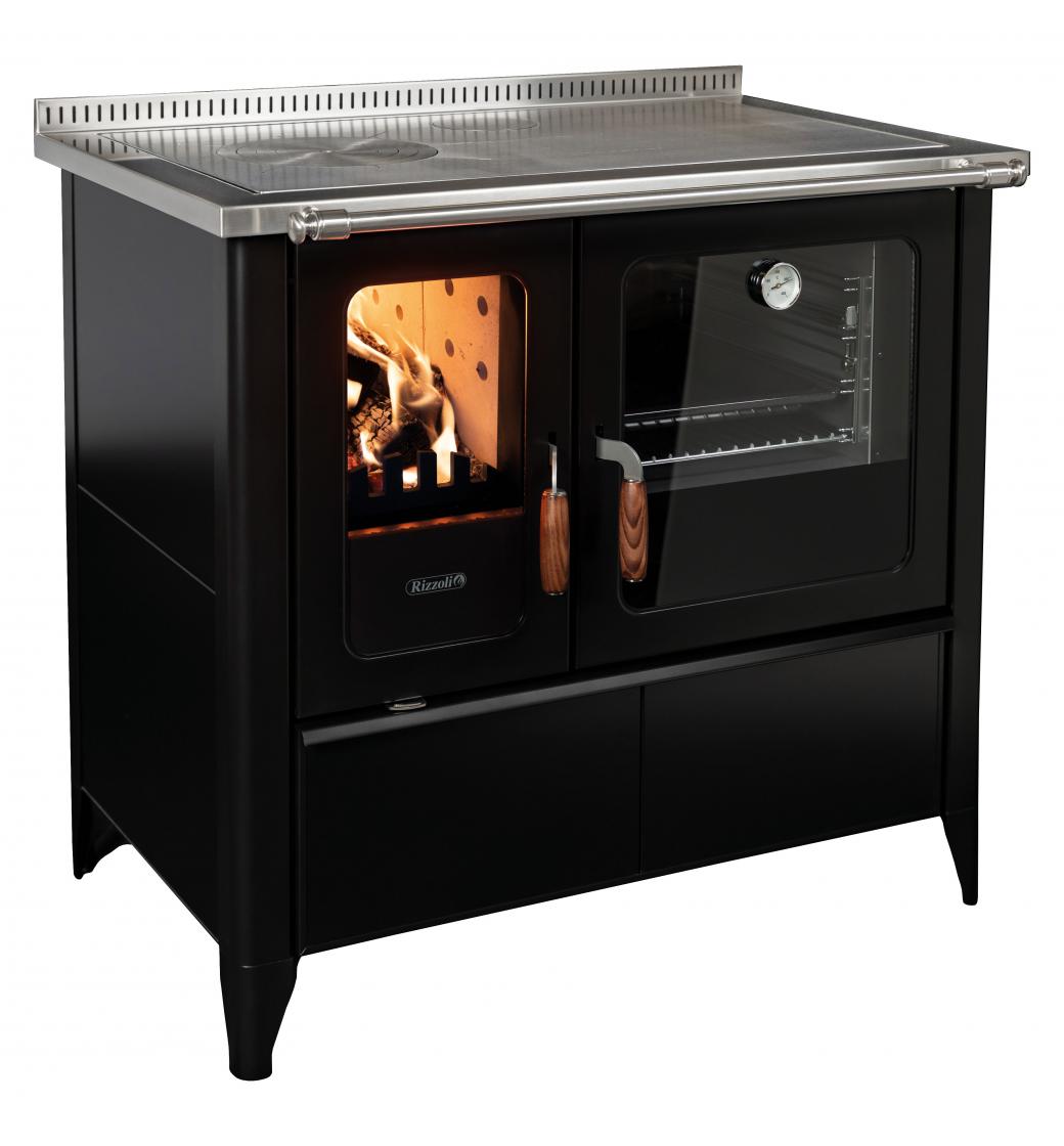 Sporák na dřevo Rizzoli N 94 Steel má lakovaný ocelový plášť sporáku, dřevěné kličky. Sporáková plotna PC2 (skládaná ze segmentů).Barevné provedení: Černá