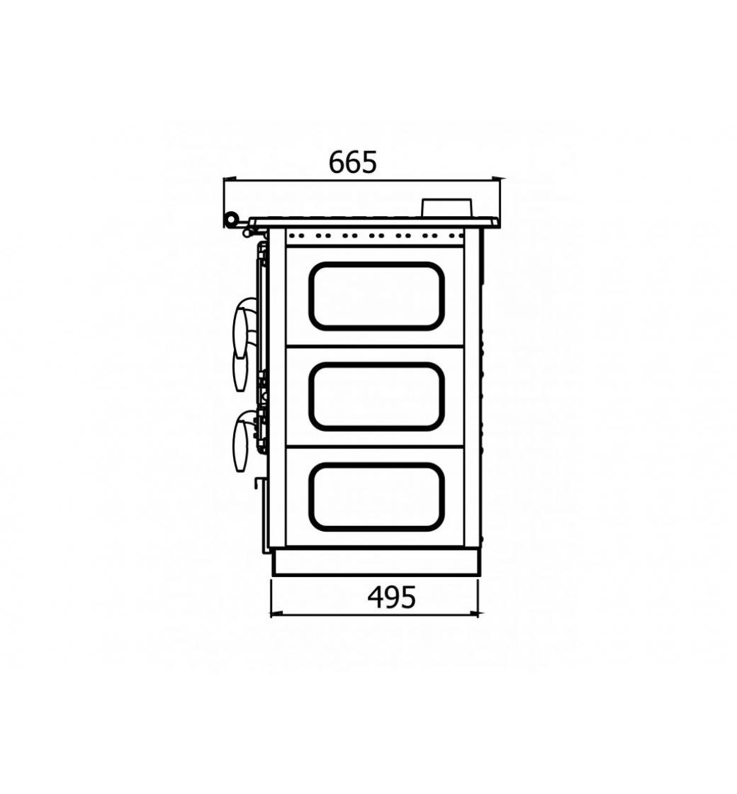 Dvířka disponují teploměrem. Prostor topeniště je vybaven dvěma rošty pro letní a zimní provoz. Pod celým sporákem se nachází praktická zásuvka, například na uskladnění paliva.