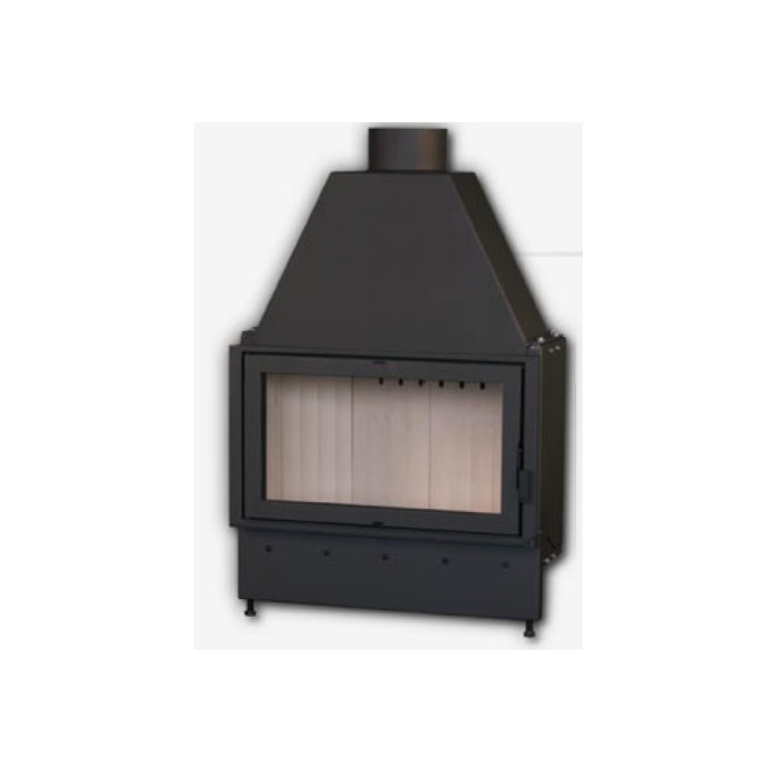 Jednoplášťová ocelová vložka s litým žárobetonem v topeništi a rovným sklem. Vnitřní popelník pod litinovým roštem, stavitelné nožičky.Teplovzdušná krbová vložka Kretz B 103