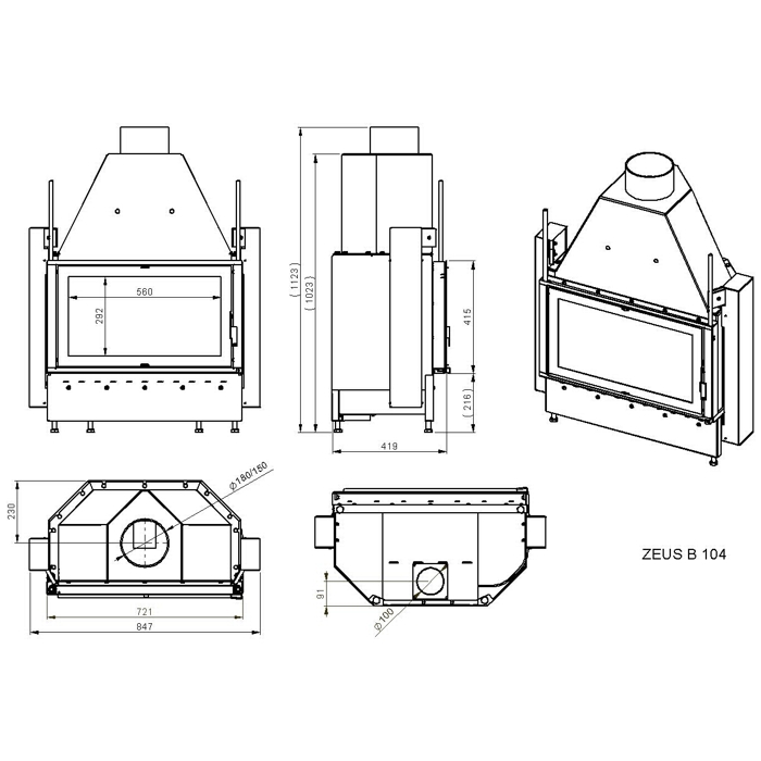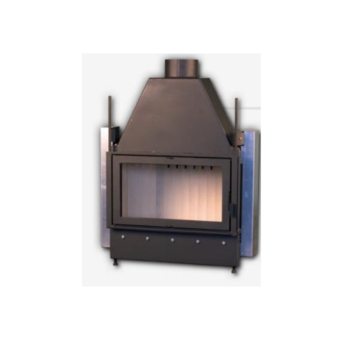 Jednoplášťová ocelová vložka s litým žárobetonem v topeništi. Dvířka s rovným sklem umožňují otevírání horním zdvihem.Teplovzdušná krbová vložka Kretz B 104