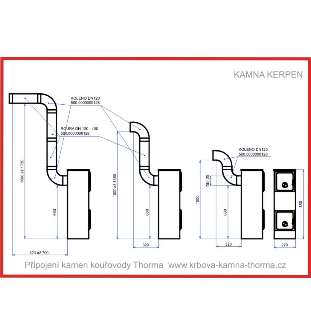 Vývod kouřovodu je zezadu pro kouřovod o průměru D120. Přikládací dvířka a dvířka popelníku jsou těsněná sklotextilní šńůrou. Na obou dvířkách je klapka pro přívod vzduchu ke spalování. Je tedy možné regulovat primární vzduch pod roš, i sekundární vzduch pro dohoření paliva (sekundární spalování) v horní spalovací komoře.